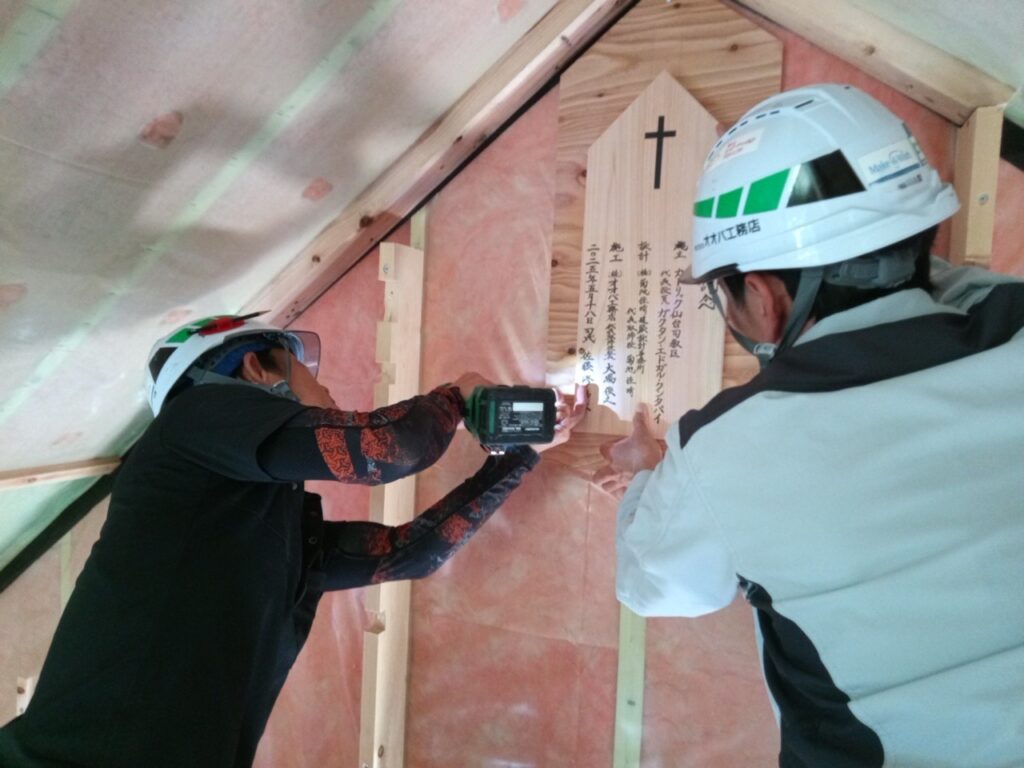 日付が前後しますが、7/22に上棟式で祈願しました棟札を、屋根の一番高いところに設置しました。