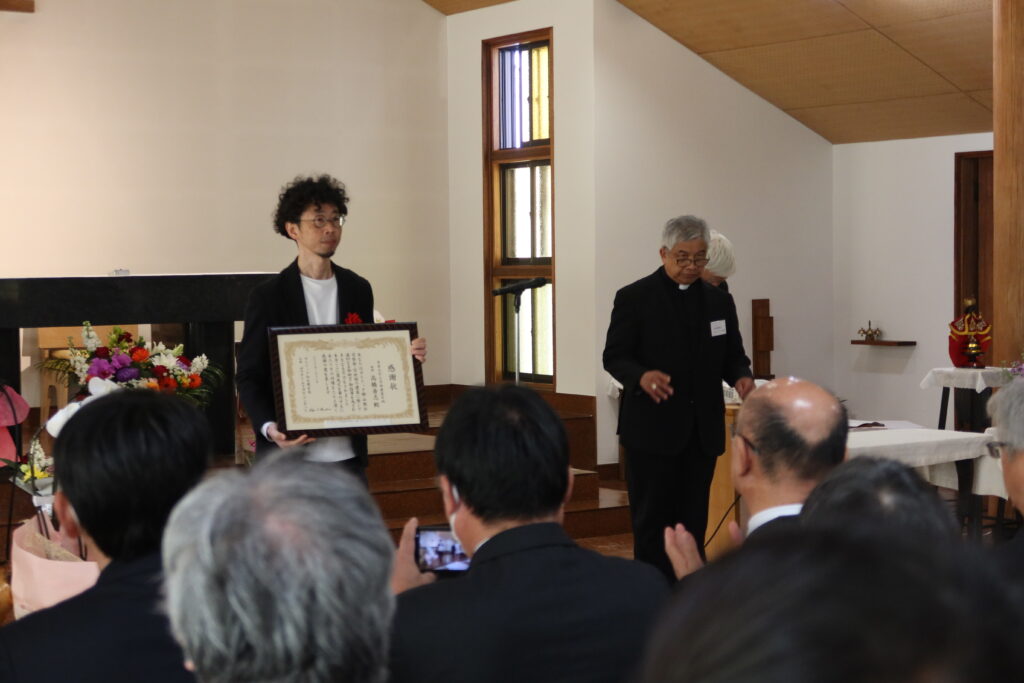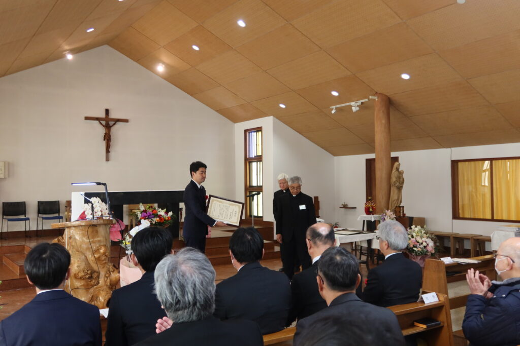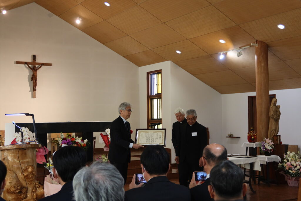 ミサ後の式典では、設計を担われた菊池佳晴建築設計事務所様、施工の株式会社オオバ工務店様、そして建設委員会の発足時から専門的見地よりご指導いただいた日本大学工学部の高橋岳志先生へ、教区長ガクタン司教様より感謝状が贈呈されました。